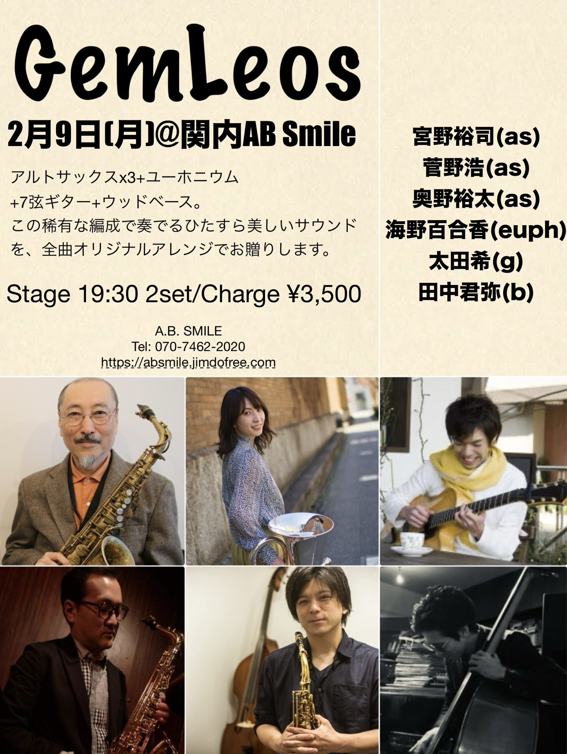 アルトサックス ×3+ユーホニウム+7弦ギター+ウッドベース。